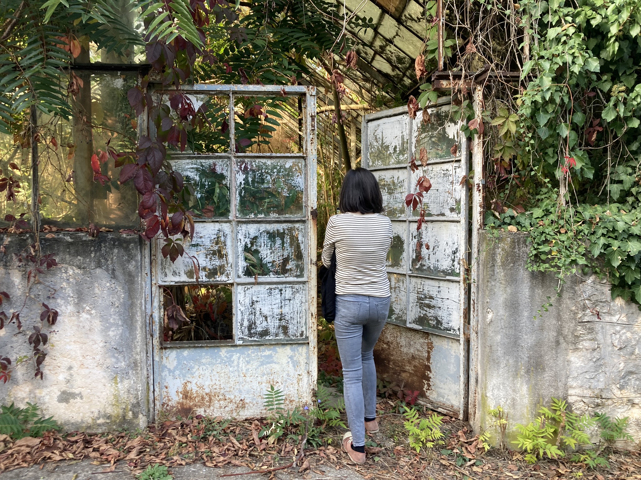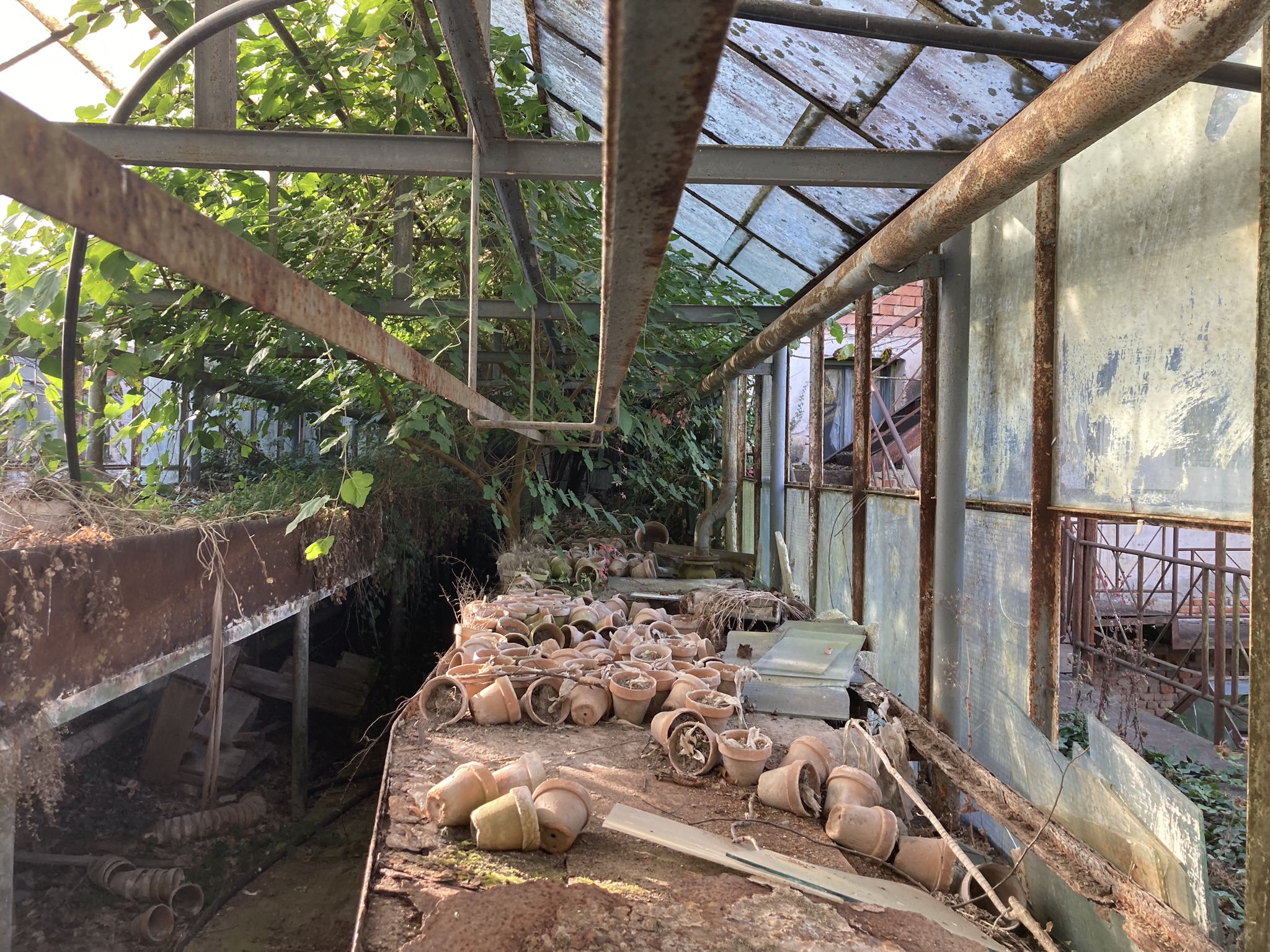 Today they are deteriorated, overrun by vegetation, scattered with piles of broken pots, dried cacti and palm trees, and with glass rooftops pierced by young trees but still full of character and potential.